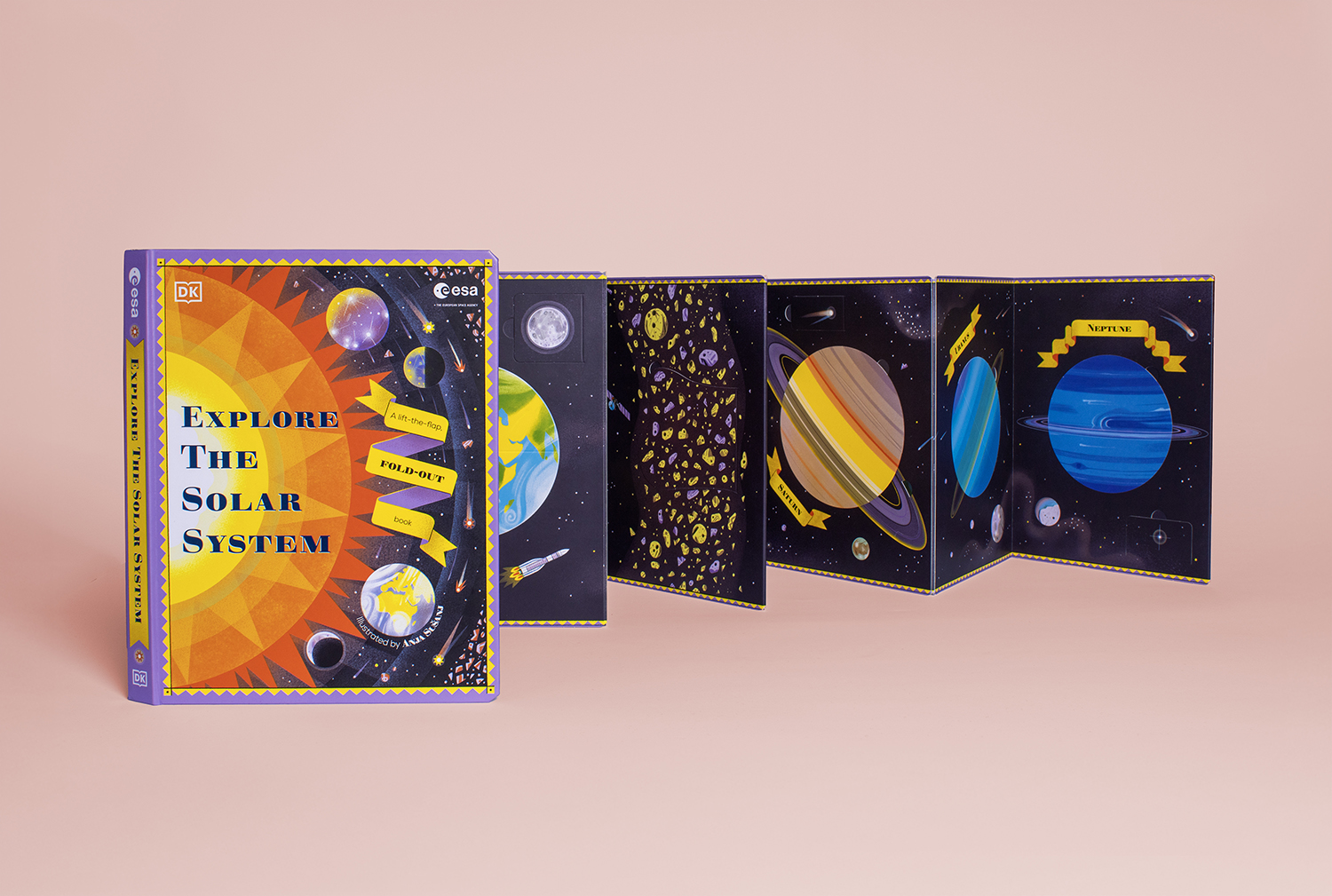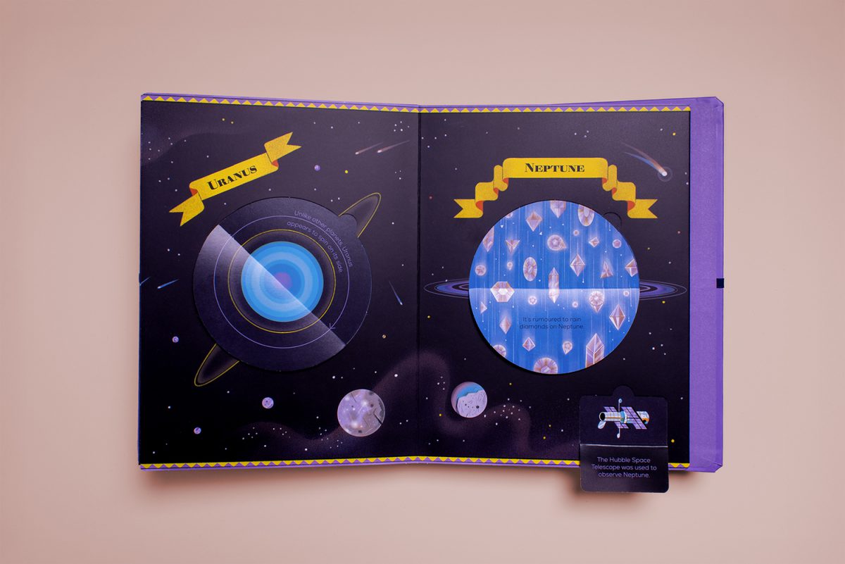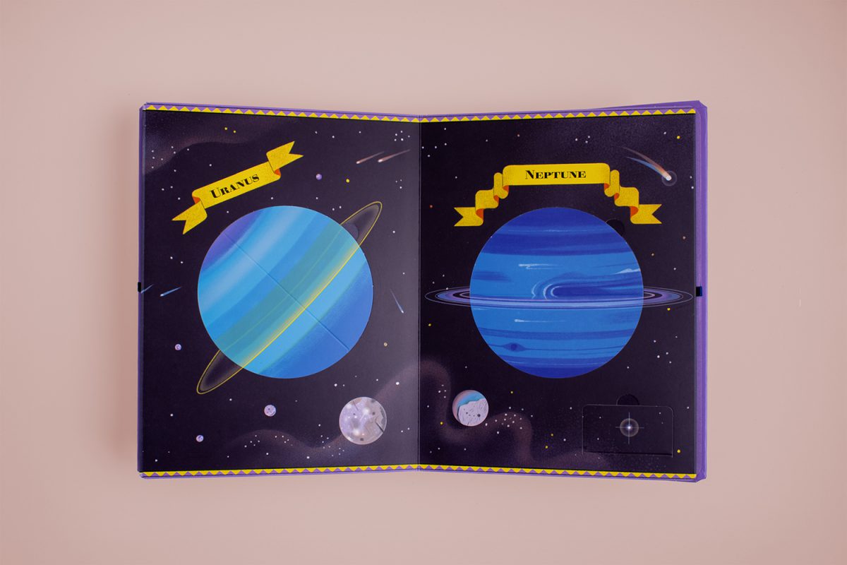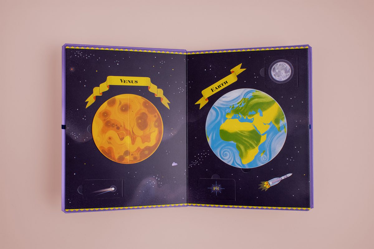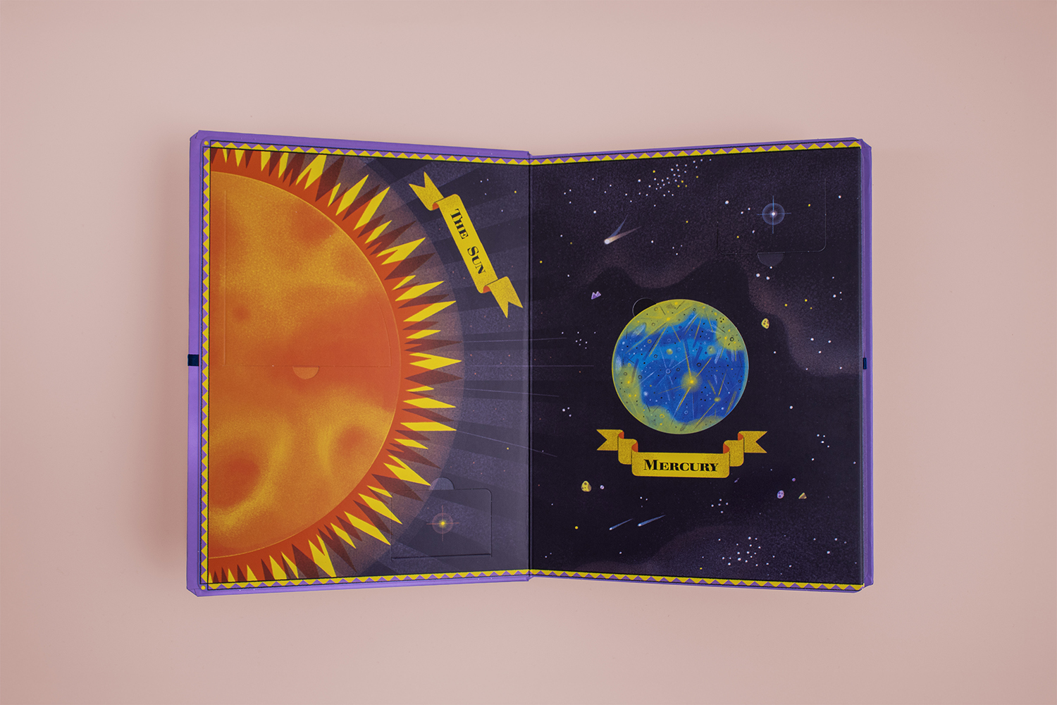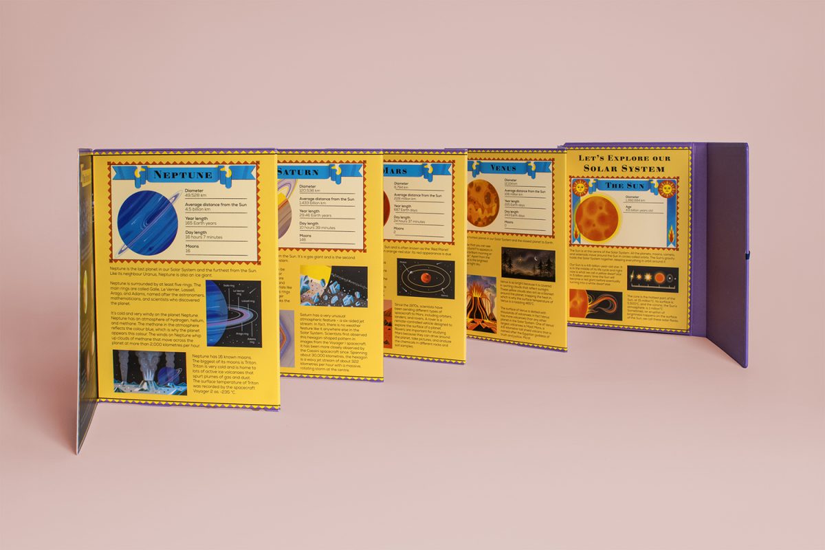 Fully illustrated, lift-the-flap concertina that lets you explore the whole Solar System, aimed at children 5+. One side of the concertina has the solar system, illustrated referencing old star maps, and the other has fact about each planet and space object mentioned.