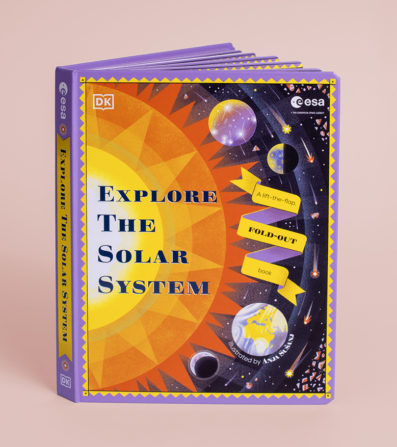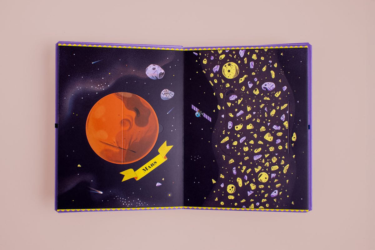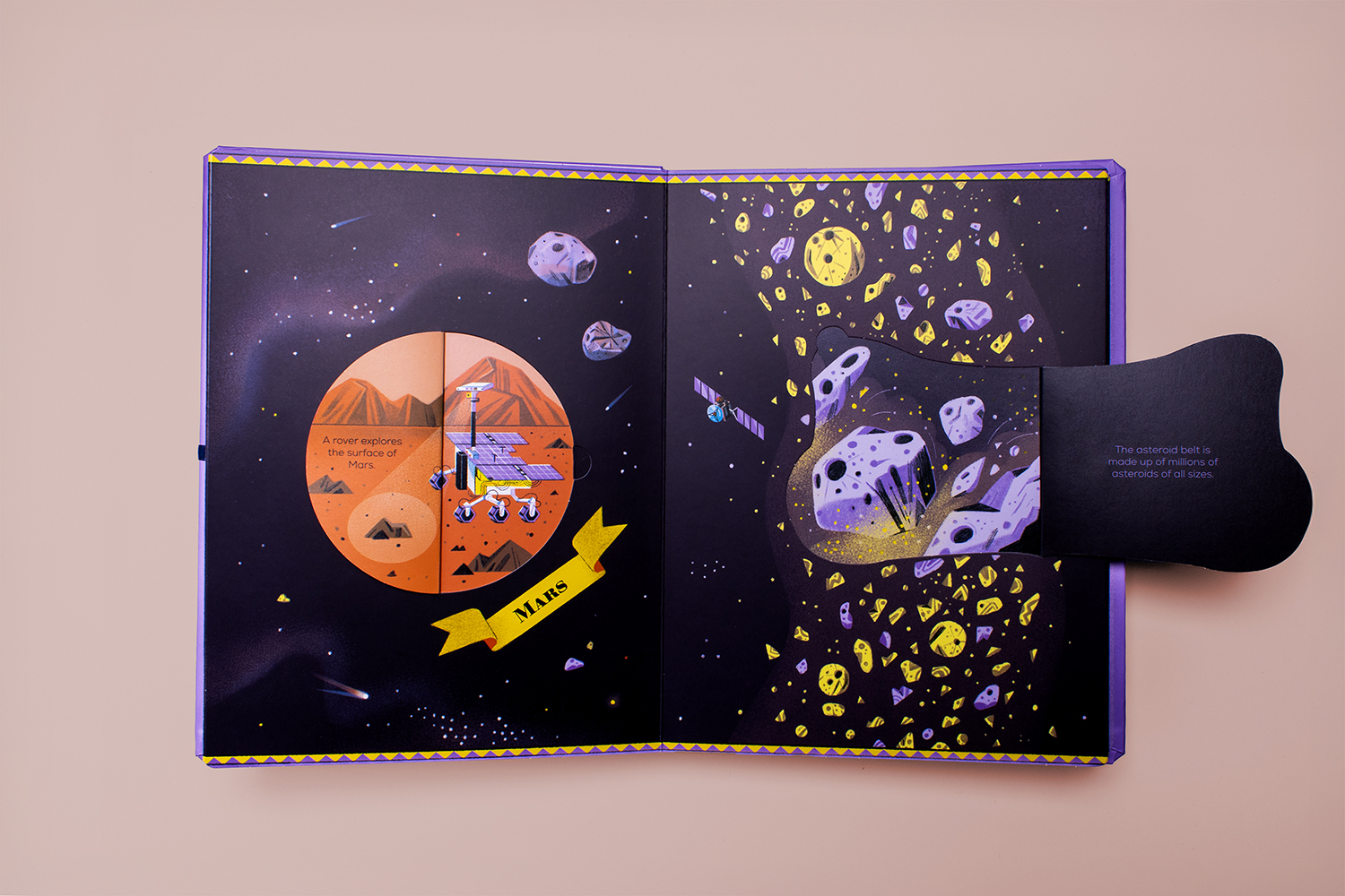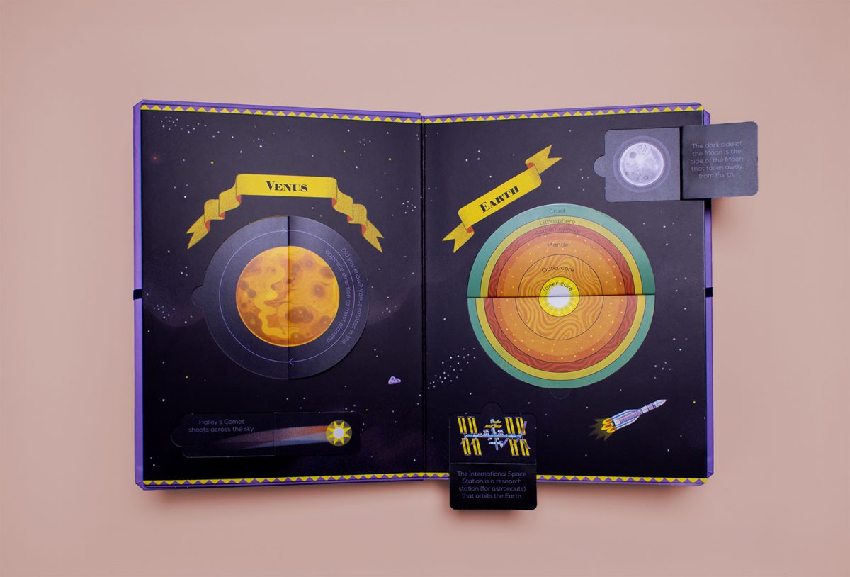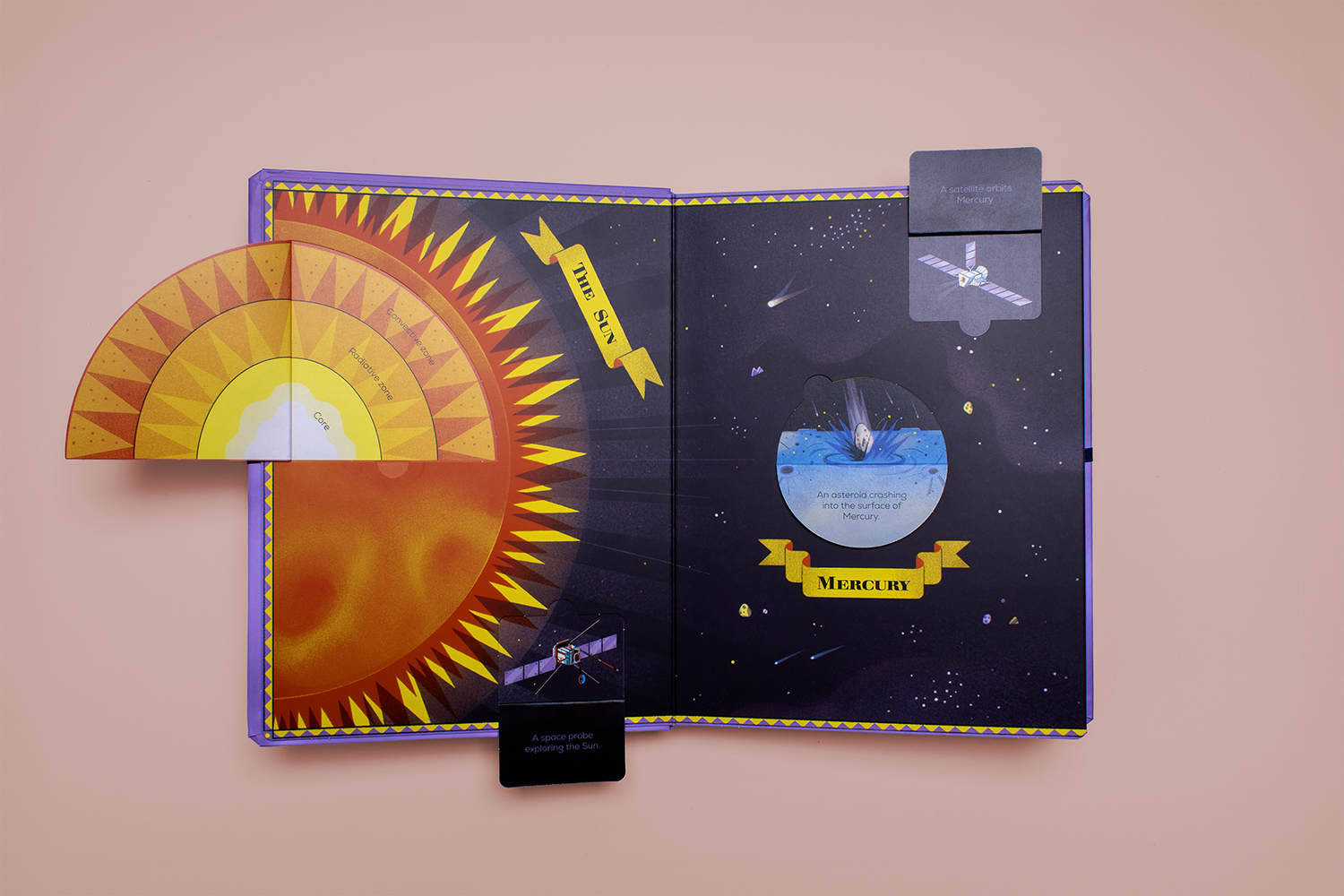 Fully illustrated, lift-the-flap concertina that lets you explore the whole Solar System, aimed at children 5+. One side of the concertina has the solar system, illustrated referencing old star maps, and the other has fact about each planet and space object mentioned.